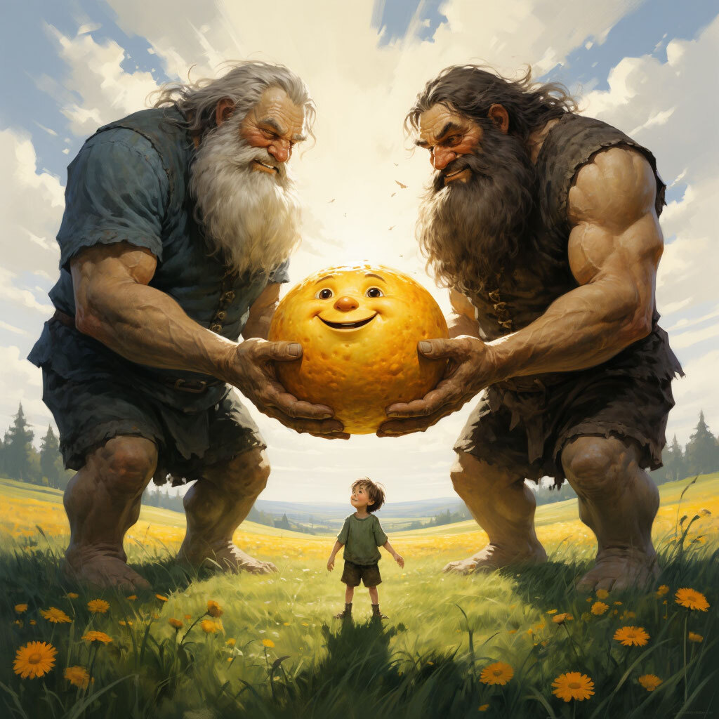 ...Однажды сидели два бога - великана Творец и Разрушитель у Бел Горюч камня и пили чай. Долго пили чай, коротко ли... И вдруг видят - Лиса догоняет Колобка - съесть его хочет. А Колобок катится под гору и песенку поет, как он от Зайца ушел, от Волка ушел и от Лисы уйдет.